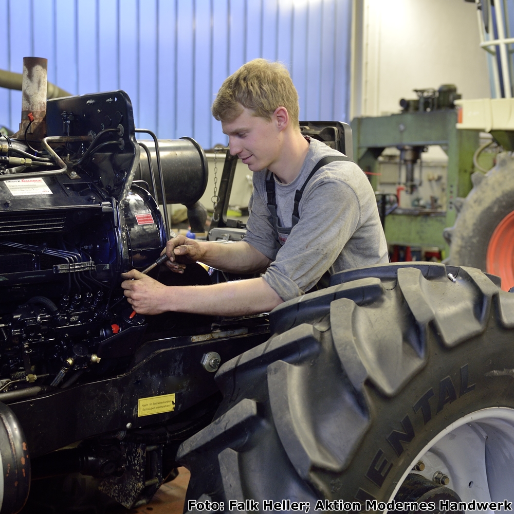 Land- und Baumaschinenmachtroniker/-innen reparieren, warten und setzen Land- und Baumaschinen, Motorgeräte und Flurförderzeuge instand. Heutzutage müssen sie dafür sowohl das mechanische als auch das digitale Handwerk beherrschen und dementsprechend Elektrik, Elektronik, Mechanik, Hydraulik, Motortechnik und Metallurgie verstehen. Digitalisierung durchdringt dabei das gesamte Handwerk und erweitert damit auch das Anforderungsprofil an die (potenziellen) Fachkräfte, die sich mit klassischen sowie voll- und teilautomatisierten Maschinen, mit Fernsteuerungssystemen, digitaler Fehlerdiagnostik oder Hybrid-, Solar- und Elektroantriebssystemen befassen und damit immer am Puls der Zeit arbeiten.